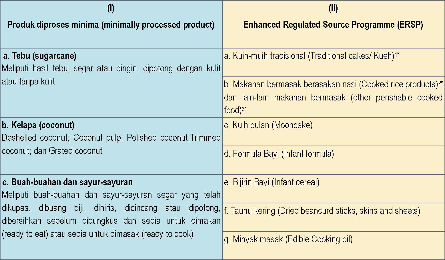 Terdapat dua program penyenaraian premis pemprosesan /pengeksport makanan ke Singapura mengikut kategori produk seperti berikut: