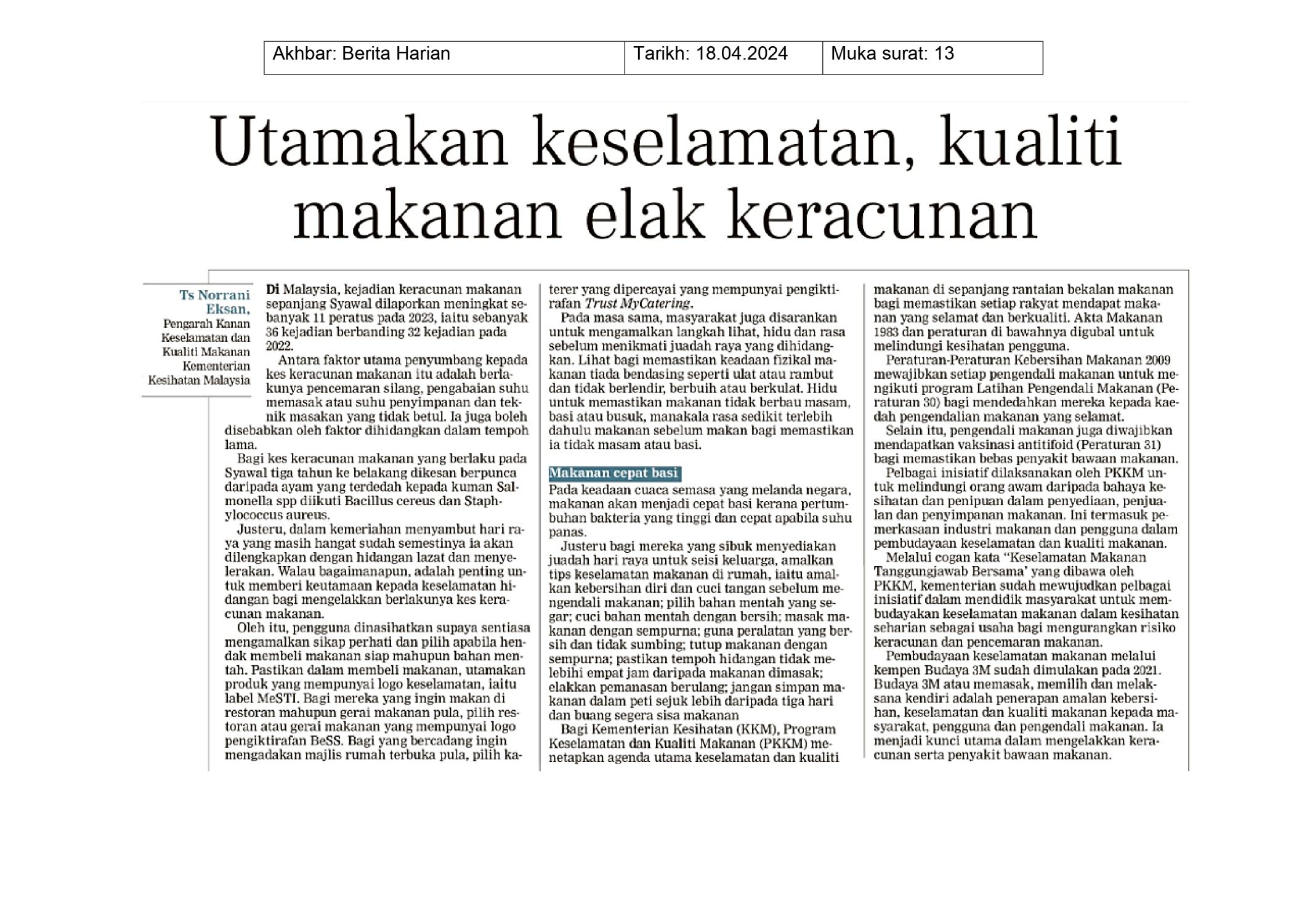 BERITA HARIAN : UTAMAKAN KESELAMATAN, KUALITI MAKANAN ELAK KERACUNAN